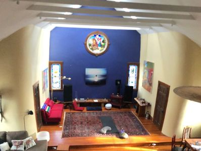 The former Grange hall houses an 1800 square foot open space with 14 foot ceilings, front porch, a cozy writing nook, and a stage. This is a great place to play. There is room to dance, stretch or paint! And anything else we want to co-create.